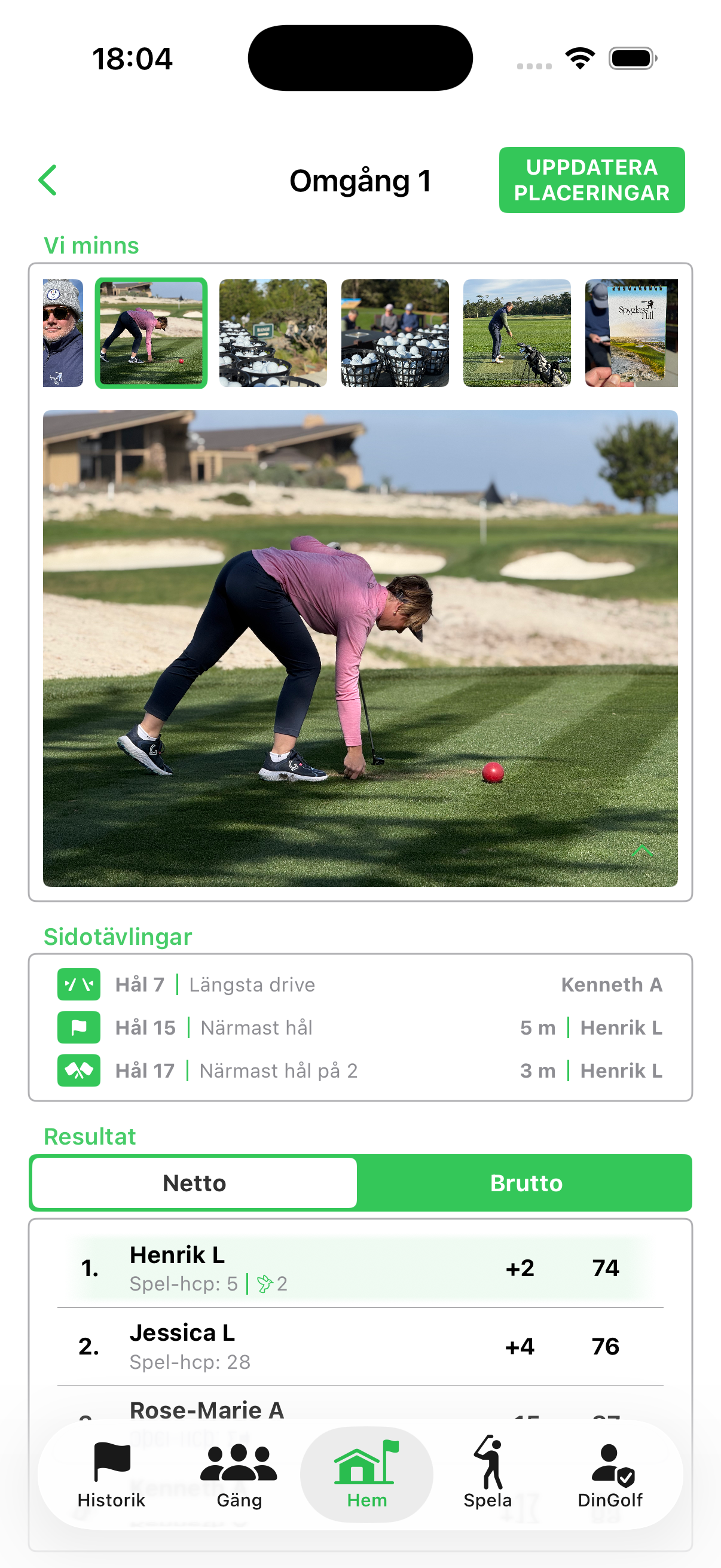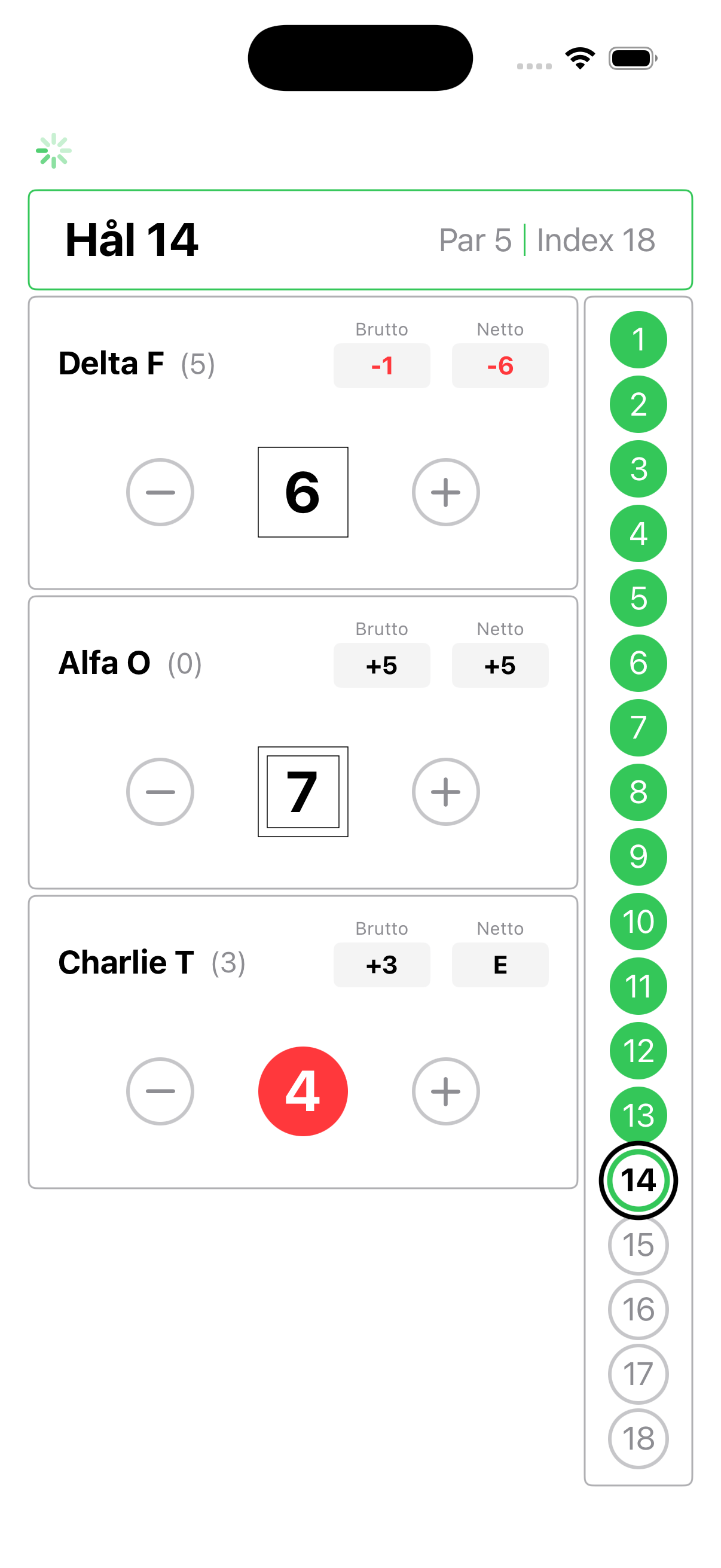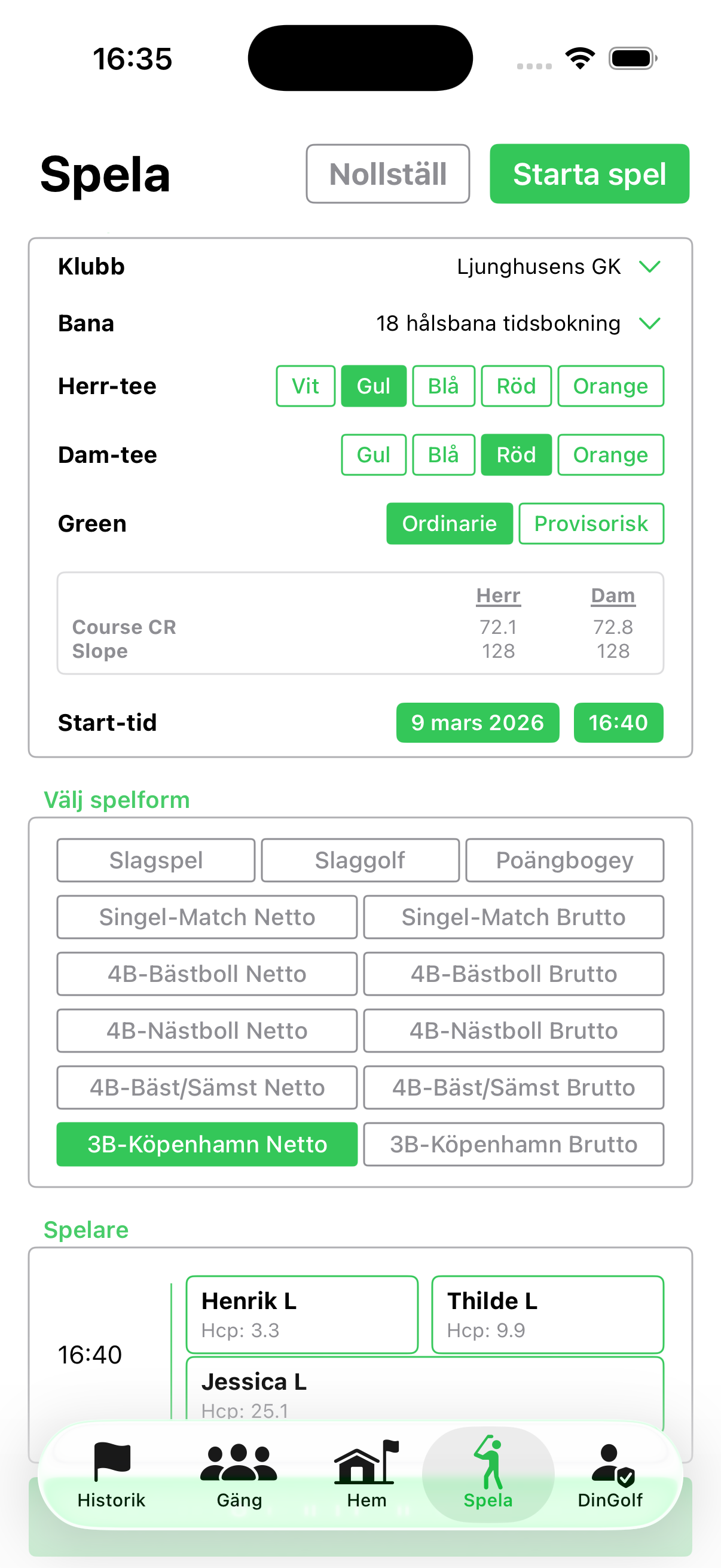 Välj bana, spelformat och deltagare med ett fåtal klick. Massor av möjligheter, kompakt presenterat och konfigurerat. Appen håller koll på spelarens mest förekommande bana, spelformat och medspelare och markerar de mest förekommande inställningarna så att du i de flesta fallen slipper lägga tid på att konfigurera dina spel på första tee.