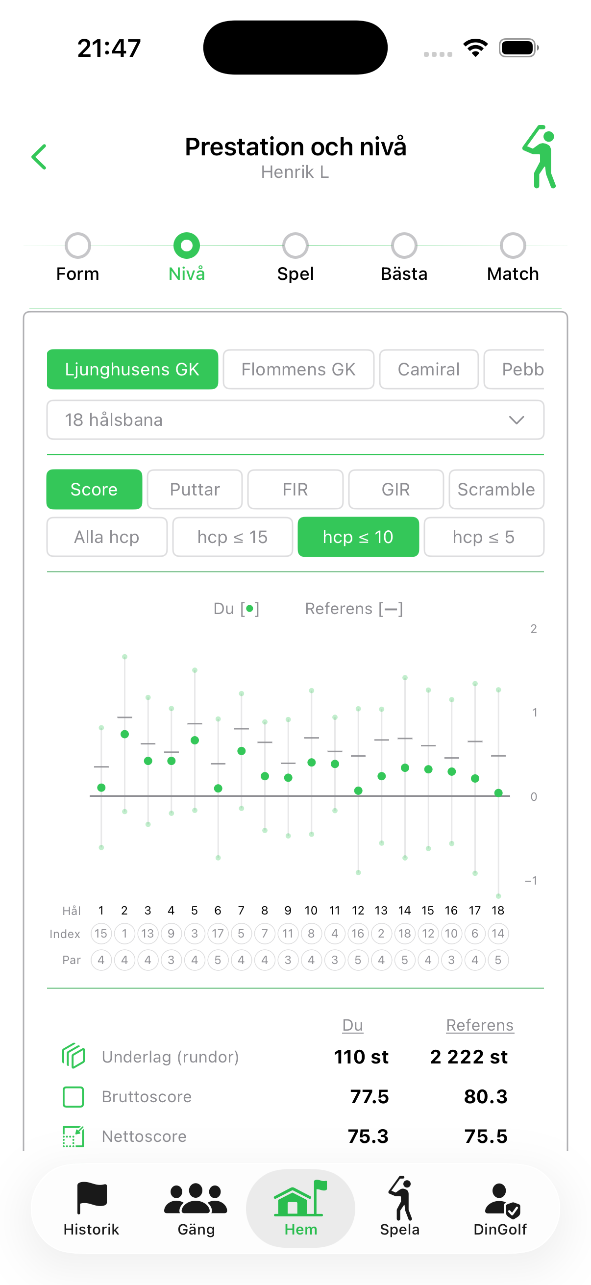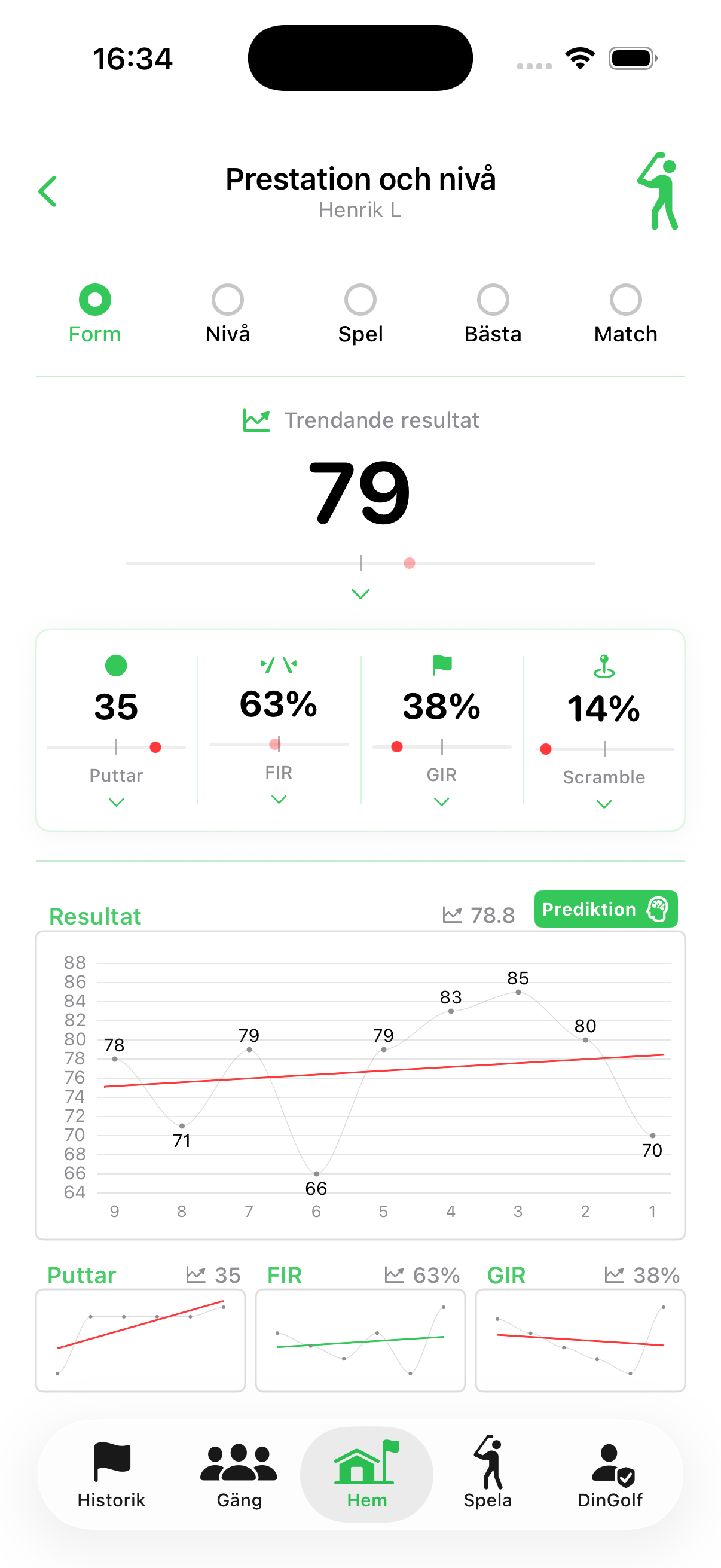 Mönster identifieras i score-datat. Även i fairwayträffar, greenträffar och antal puttar om spelaren valt att mata in dessa.